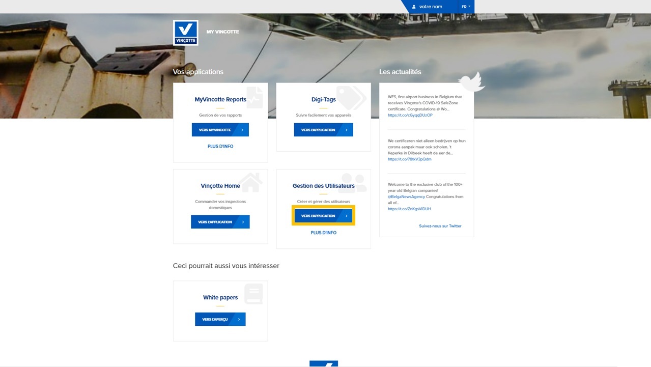 La gestion des utilisateurs a déjà été entièrement intégrée dans le nouveau portail client. Cliquez d'abord sur MyVinçotte en haut à droite de la page.